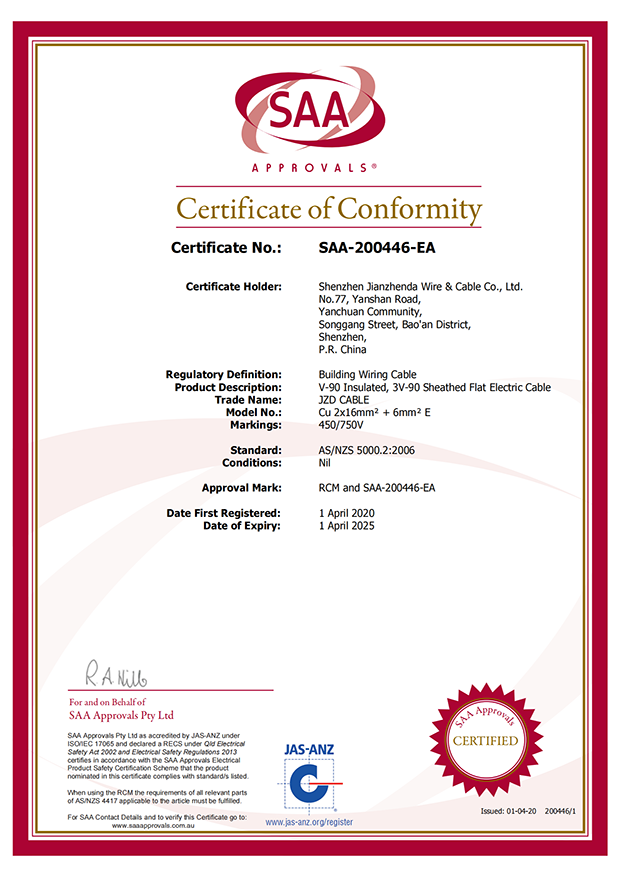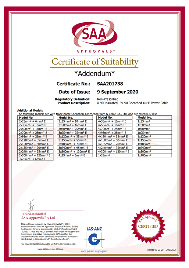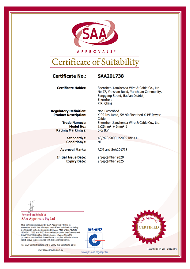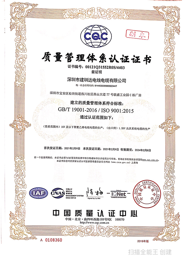 深圳建圳達電線電纜有限公司,成立于2000年,是一家電線電纜制造商,我們通過了世界各地不同市場的多數(shù)認證,如:CCC、RoHS、CB、SAA、TUV、VDE、PSE、BPS、UL、CSA。我們根據定制產品不斷更新新的認證。經過數(shù)十年的發(fā)展,我們與來自世界各地的客戶建立了長期的合作關系。我們曾經是菲律賓機場,,柬埔寨的電力站,美國的醫(yī)院,工廠,埃塞俄比亞的水電站項目。我們是一家值得信賴的電線供應商。